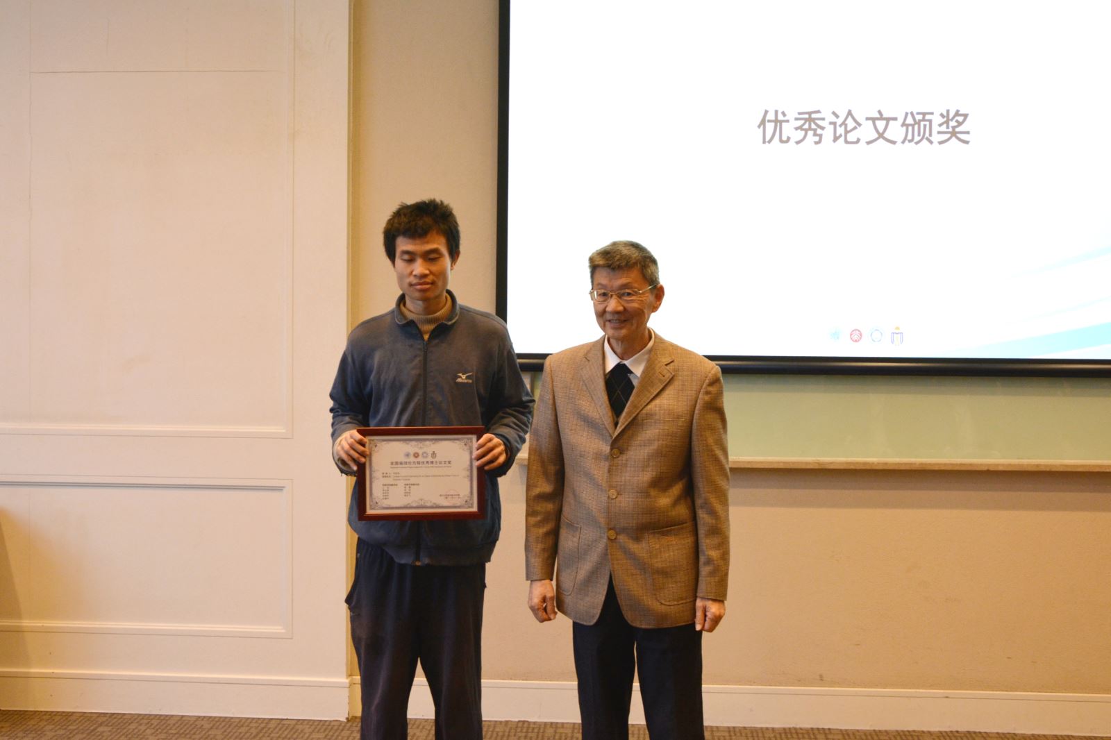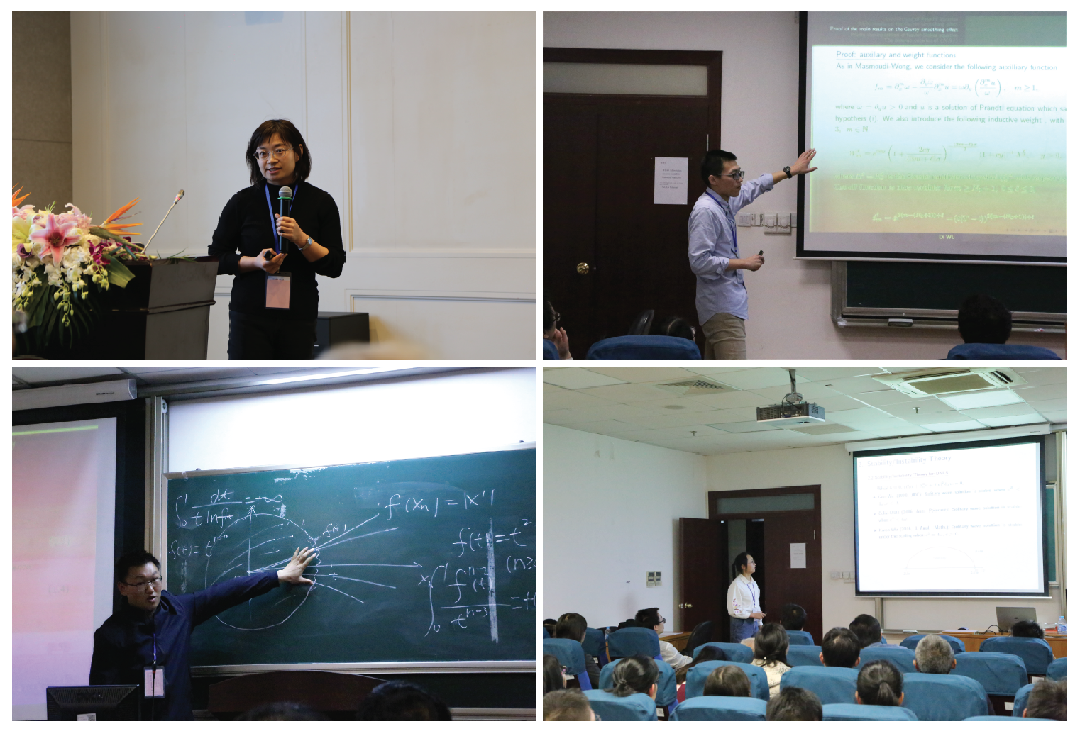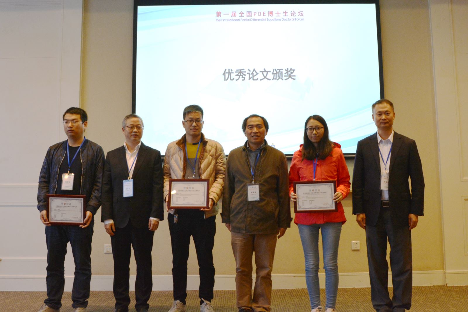 全国偏微分方程优秀博士论文奖获得者韦东奕(北京大学),优秀博士论文提名奖获得者程建峰(四川大学)、刘珏(清华大学)、王渝西(北京大学)分别上台领奖。