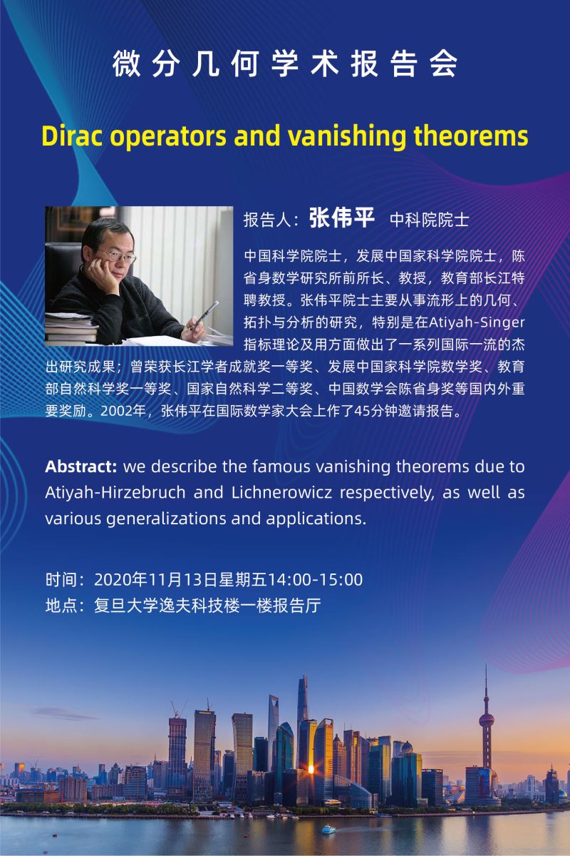 简介:张伟平,中国科学院院士,发展中国家科学院院士,陈省身数学研究所前所长、教授,教育部长江特聘教授。张伟平院士主要从事流形上的几何、拓扑与分析的研究,特别是在Atiyah-Singer指标理论及用方面做出了一系列国际一流的杰出研究成果;曾荣获长江学者成就奖一等奖、发展中国家科学院数学奖、教育部自然科学奖一等奖、国家自然科学二等奖、中国数学会陈省身奖等国内外重要奖励。2002年,张伟平在国际数学家大会上作了45分钟邀请报告。