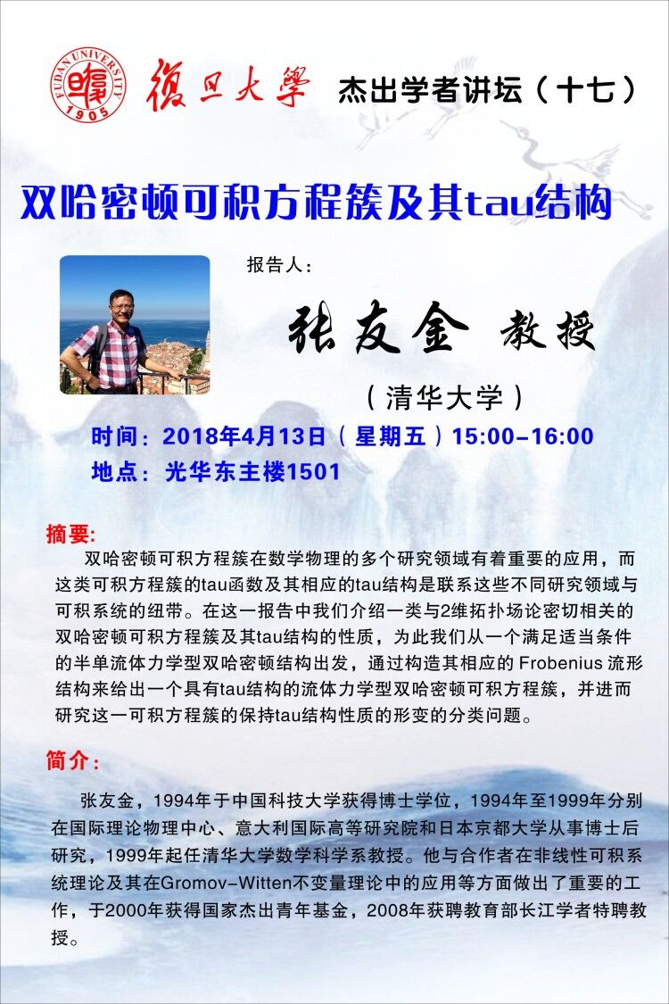 | Presentation Name: | 杰出学者讲坛(十七):双哈密顿可积方程簇及其tau结构 |