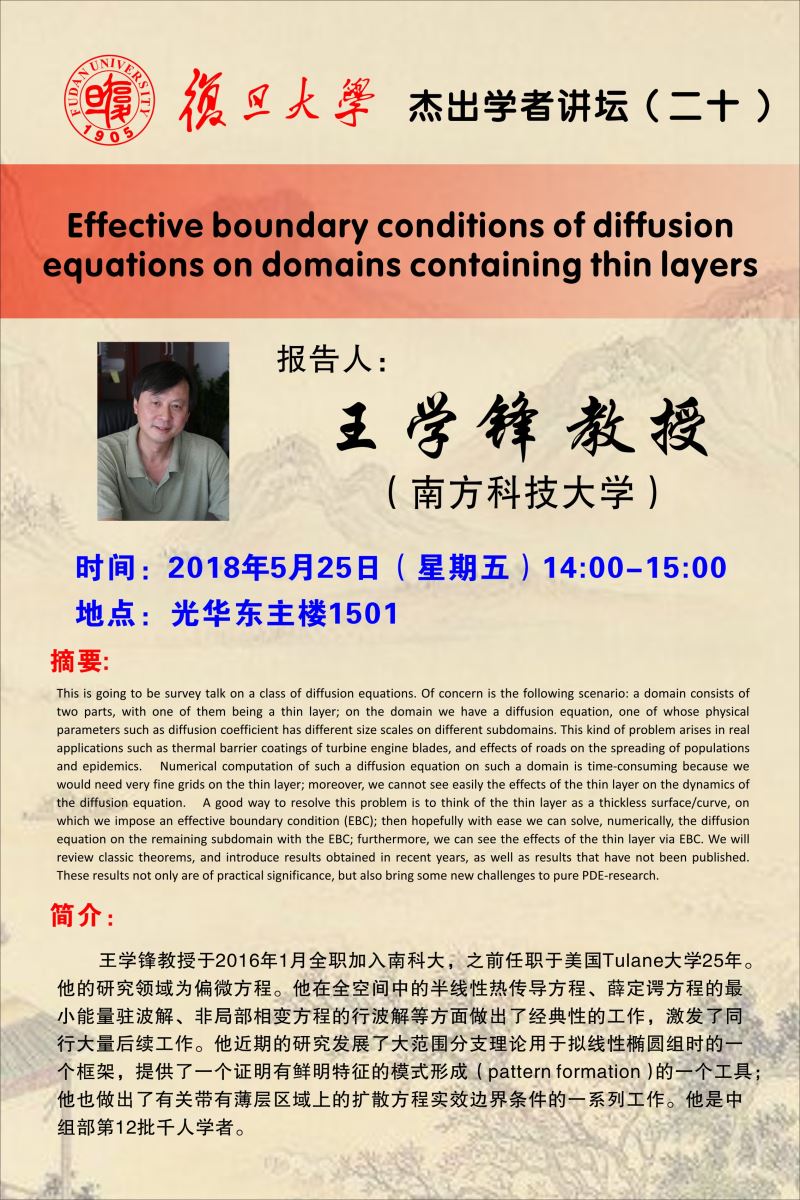 | Presentation Name: | 杰出学者讲坛(二十):Effective boundary conditions of diffusion equations on domains containing thin layers |