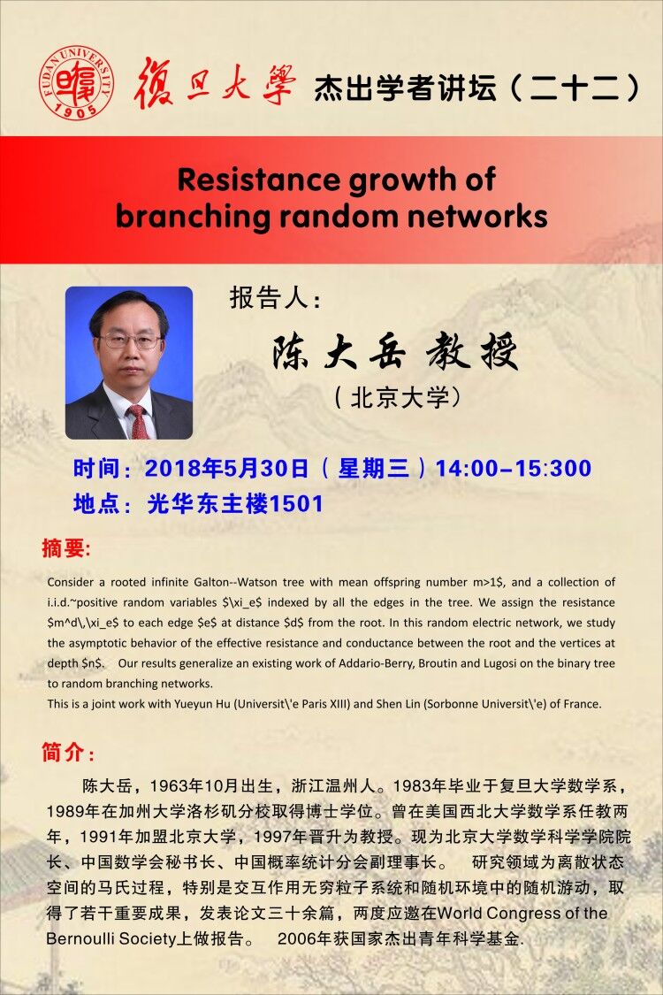 | Abstract: | 摘要:Consider a rooted infinite Galton--Watson tree with mean offspring number m>1$, and a collection of i.i.d.~positive random variables $/xi_e$ indexed by all the edges in the tree. We assign the resistance $m^d/,/xi_e$ to each edge $e$ at distance $d$ from the root. In this random electric network, we study the asymptotic behavior of the effective resistance and conductance between the root and the vertices at depth $n$. Our results generalize an existing work of Addario-Berry, Broutin and Lugosi on the binary tree to random branching networks. This is a joint work with Yueyun Hu (Universit/'e Paris XIII) and Shen Lin (Sorbonne Universit/'e) of France. 简介:陈大岳,1963年10月出生,浙江温州人。1983年毕业于复旦大学数学系,1989年在加州大学洛杉矶分校取得博士学位。曾在美国西北大学数学系任教两年,1991年加盟北京大学,1997年晋升为教授。现为北京大学数学科学学院院长、中国数学会秘书长、中国概率统计分会副理事长。研究领域为离散状态空间的马氏过程,特别是交互作用无穷粒子系统和随机环境中的随机游动,取得了若干重要成果,发表论文三十余篇,两度应邀在World Congress of the Bernoulli Society上做报告。2006年获国家杰出青年科学基金。
