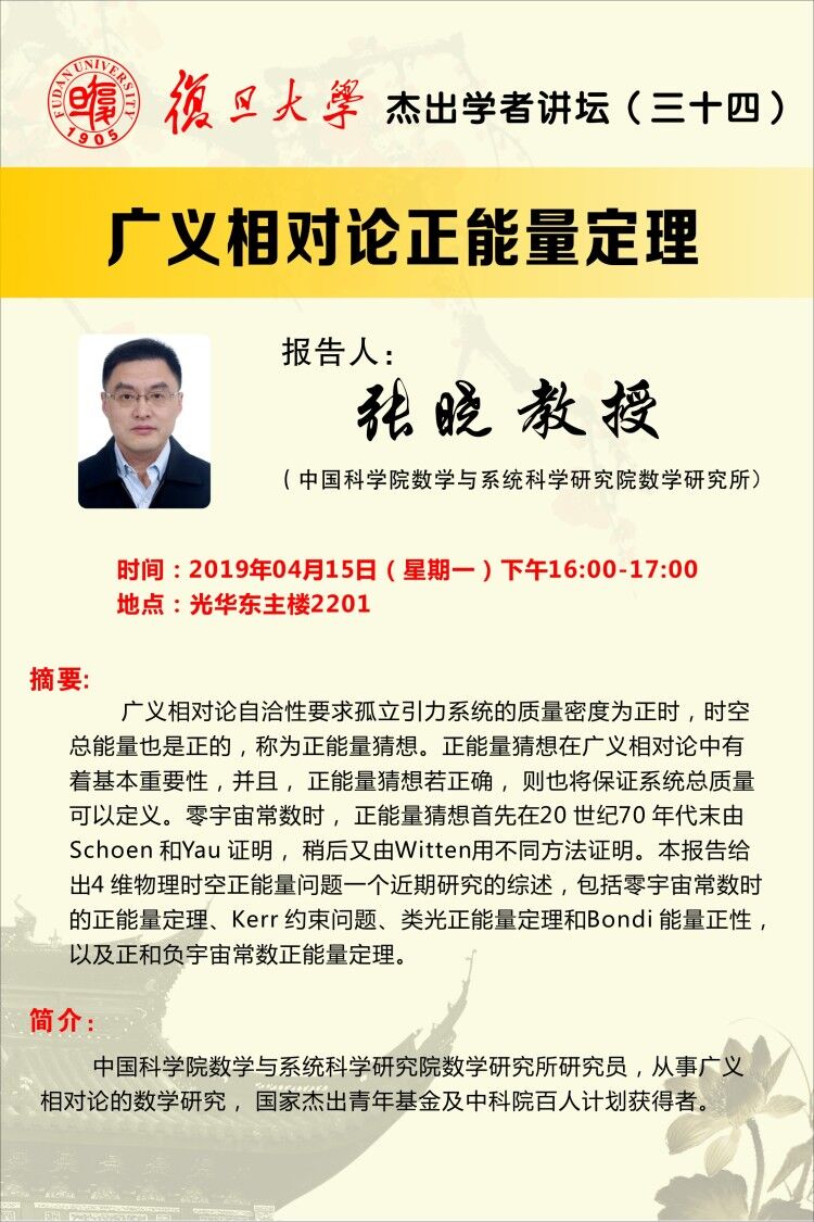 | Presentation Name: | 杰出学者讲坛(三十四):广义相对论正能量定理 |