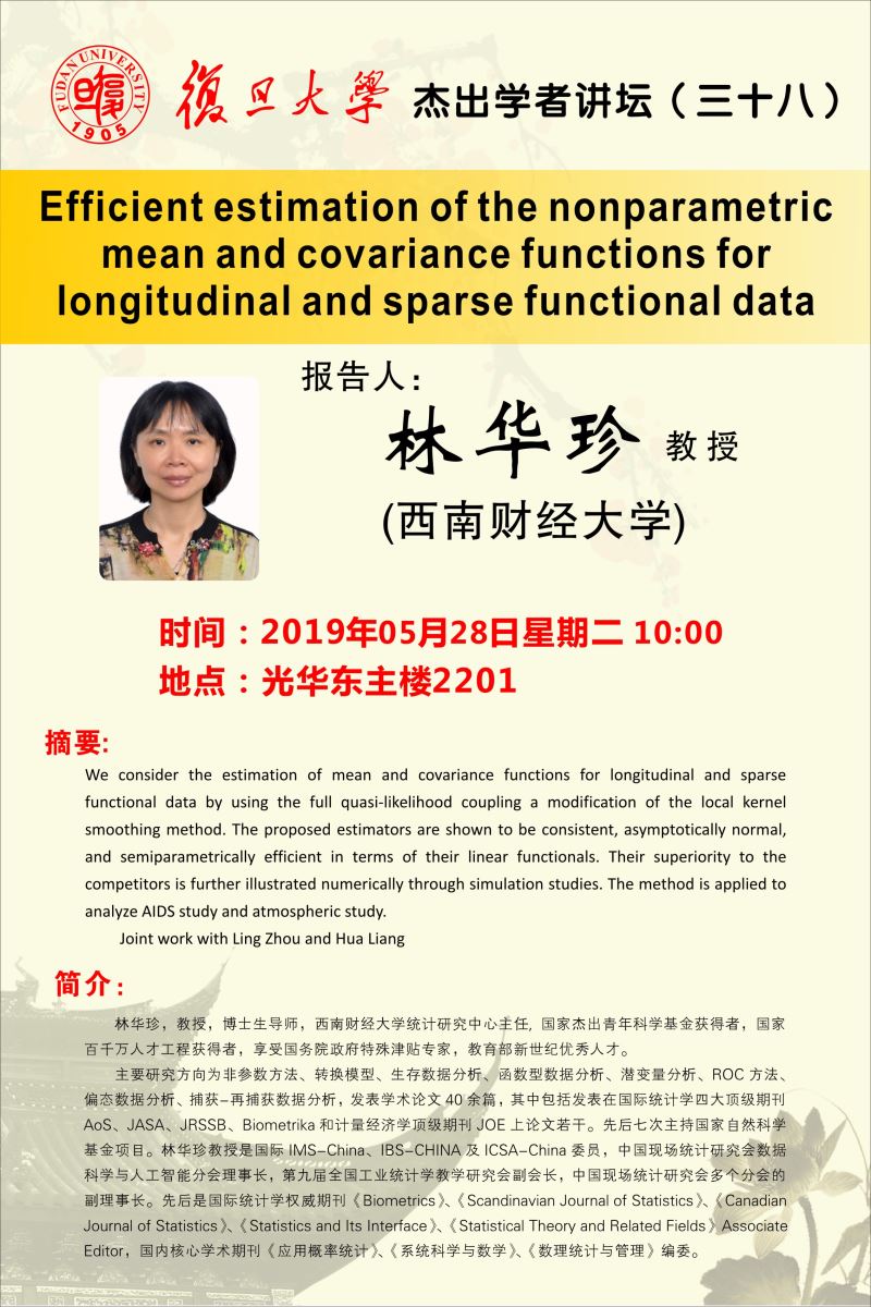 | Presentation Name: | 杰出学者讲坛(三十八):Efficient estimation of the nonparametric mean and covariance functions for longitudinal and sparse functional data |