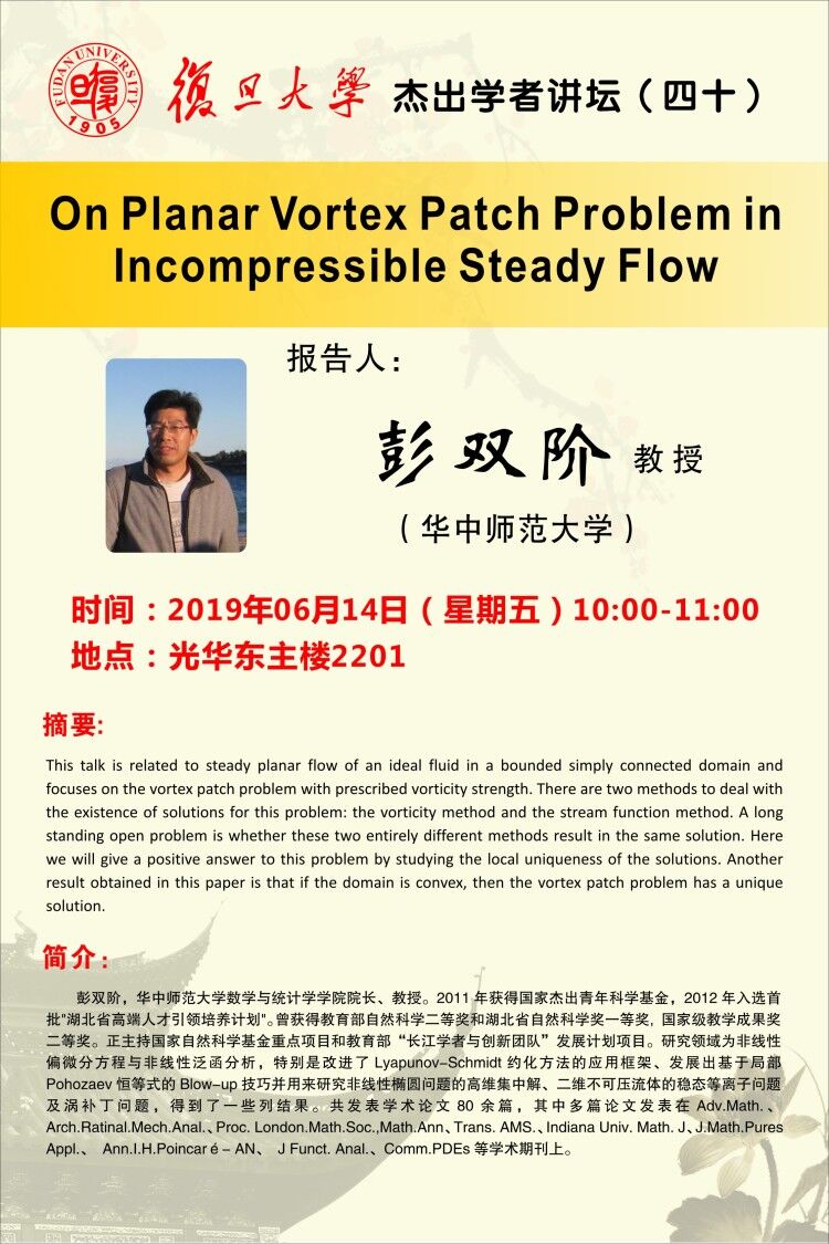 | Presentation Name: | 杰出学者讲坛(四十):On Planar Vortex Patch Problem in Incompressible Steady Flow |