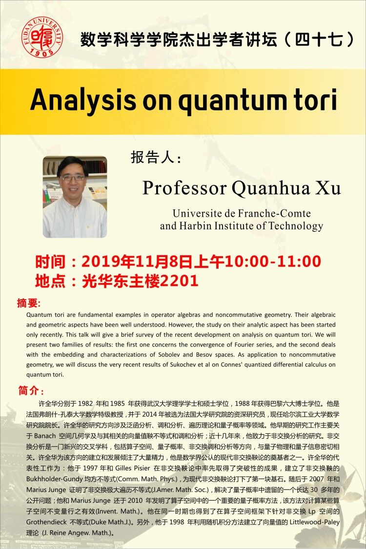 | Presentation Name: | 杰出学者讲坛(四十七): Analysis on quantum tori |