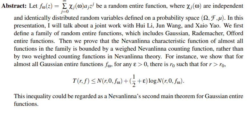 | Presentation Name: | Nevanlinna's Second Main Theorems for Random Entire Functions I |