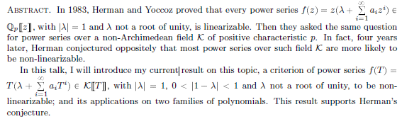 | Presentation Name: | 午间学术报告会(一百二十三):Linearizability of power series over a non-archimedean field of positive characteristic |