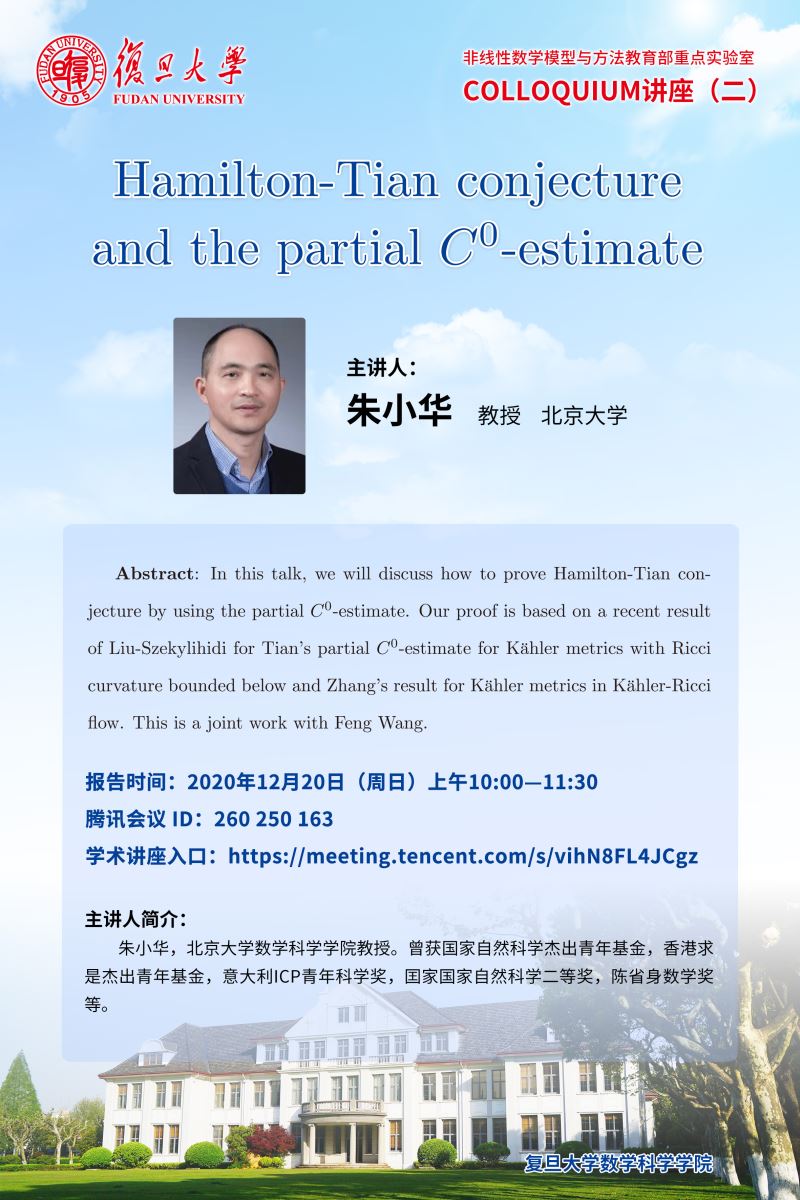 | Presentation Name: | 非线性数学模型与方法教育部重点实验室Colloquium系列讲座(二):Hamilton-Tian conjecture and the partial C0-estimate |